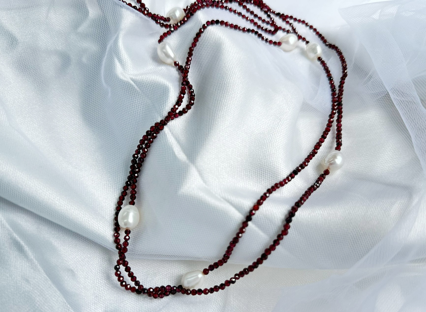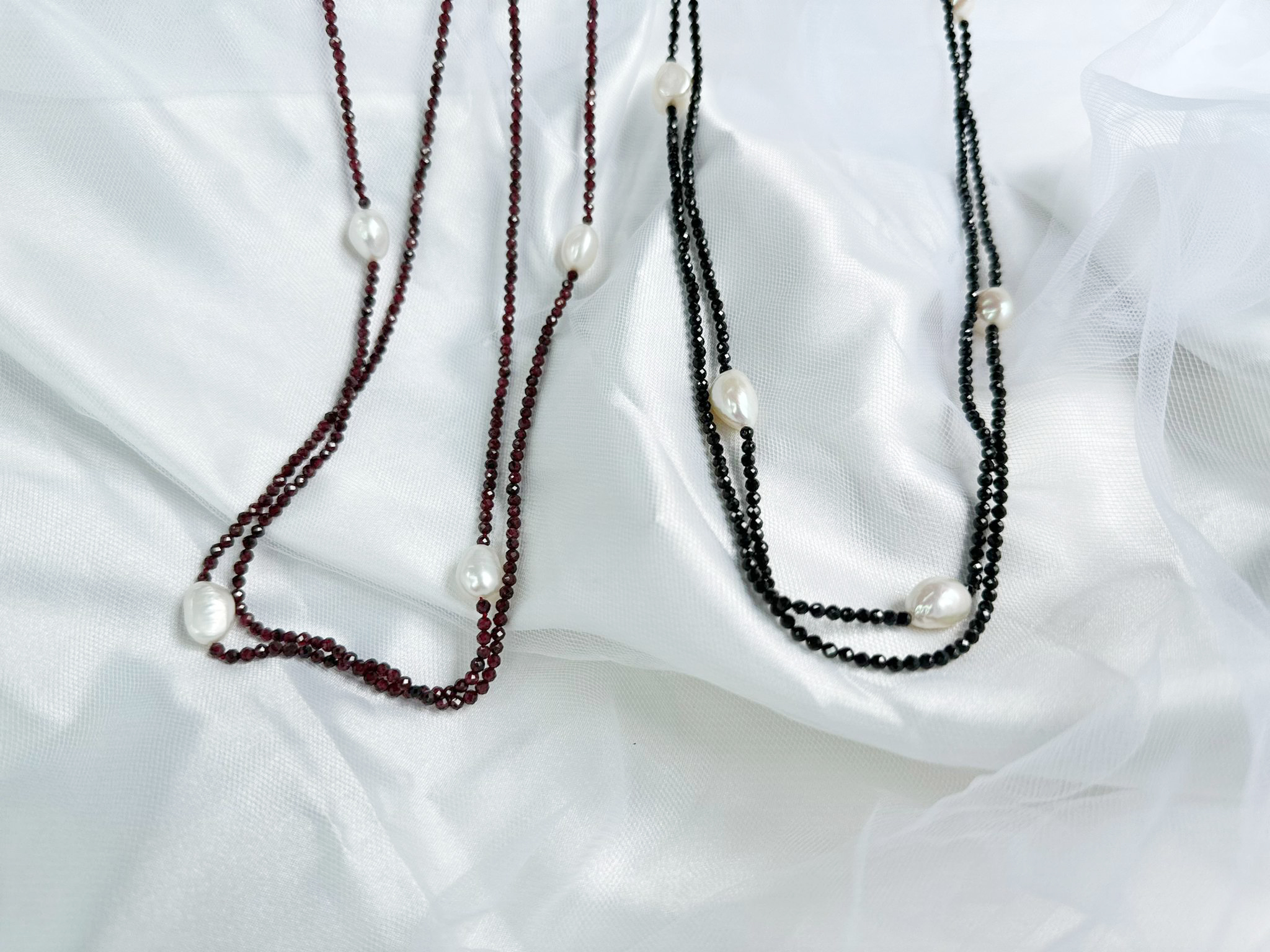 Modern and minimal, this necklace makes an eye-catching, effortless statement. A composition of 2.7mm faceted garnt beads, and 9-10mm freshwater flat rice pearls are arranged along the 180cm cord to create a continuous strand. Eclectic and easy-to-wear, this necklace can be worn doubled, tripled or wrapped around 4 times! Perfect alone, it also adds new life to your favorite layered looks.