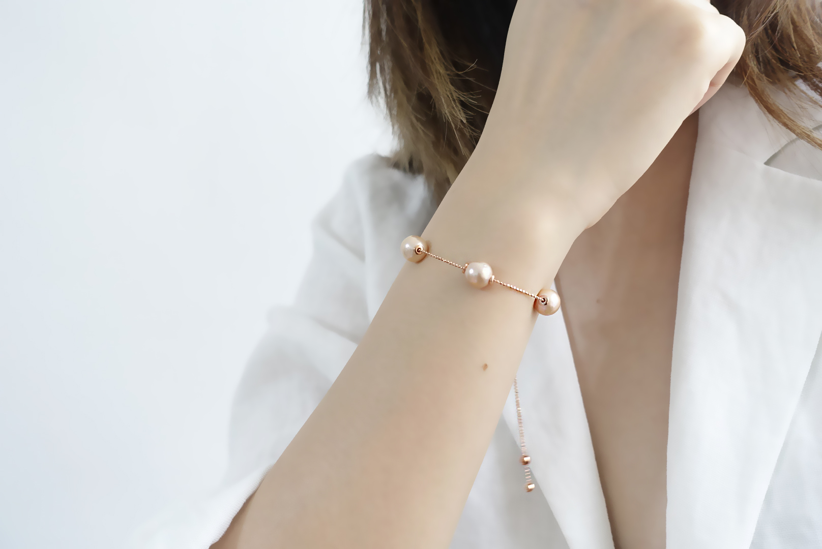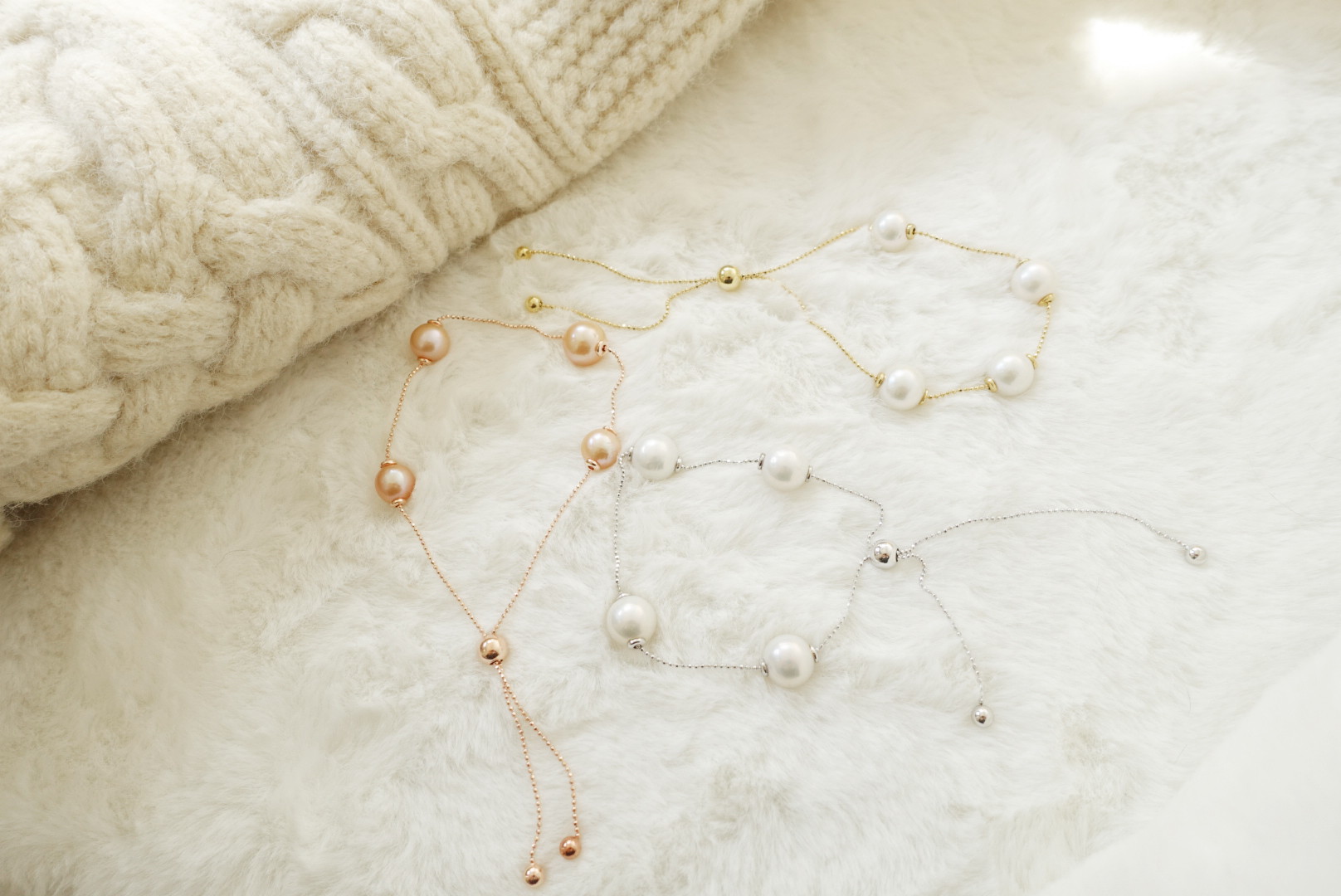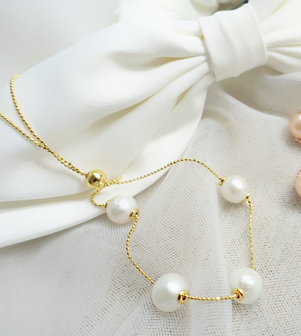 Versatile in design, this movable pearl bracelet features 5 round freshwater pearls sizes from 10mm each, can slide or be affixed in different formations. Arrange either as a stationed pearl bracelet or together as a pearl smile bracelet. The sterling silver chain can be adjusted according to preference size.