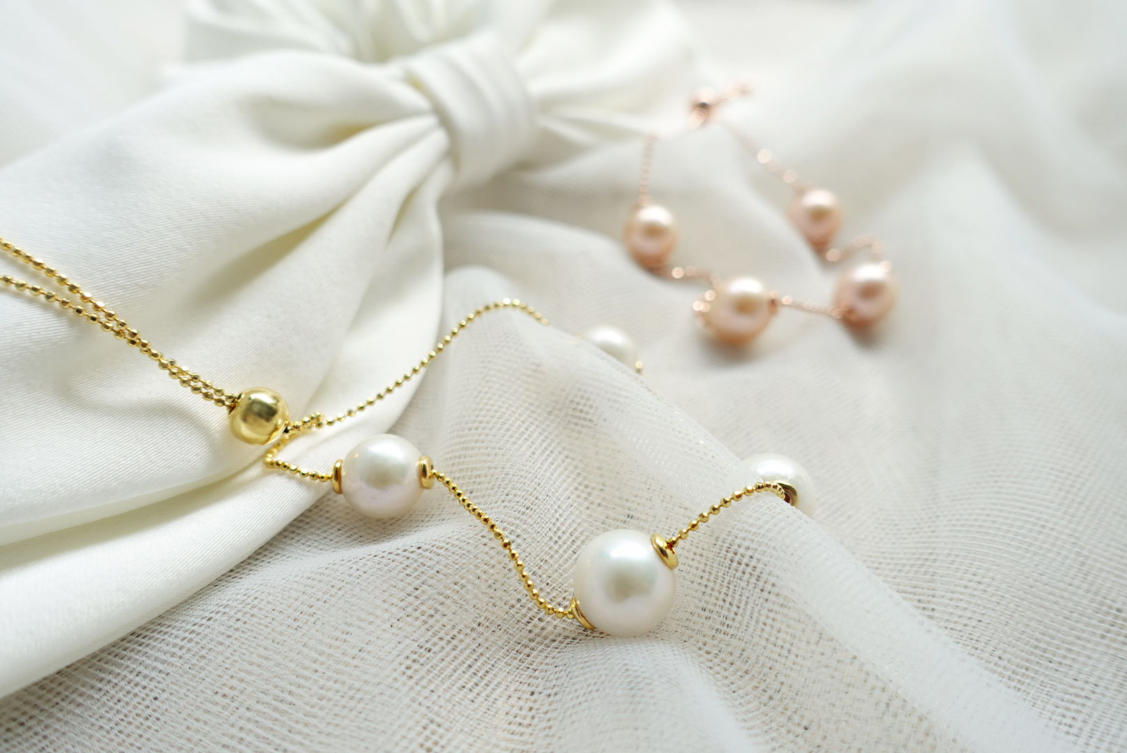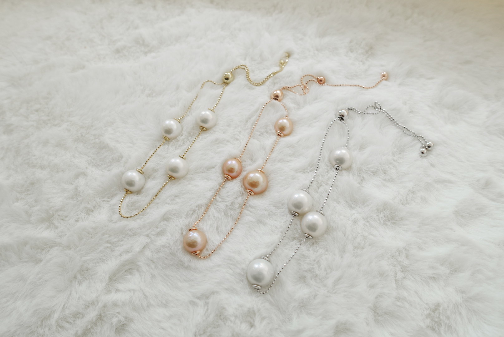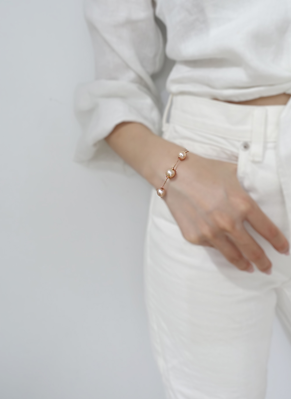 Versatile in design, this movable pearl bracelet features 5 round freshwater pearls sizes from 10mm each, can slide or be affixed in different formations. Arrange either as a stationed pearl bracelet or together as a pearl smile bracelet. The sterling silver chain can be adjusted according to preference size.