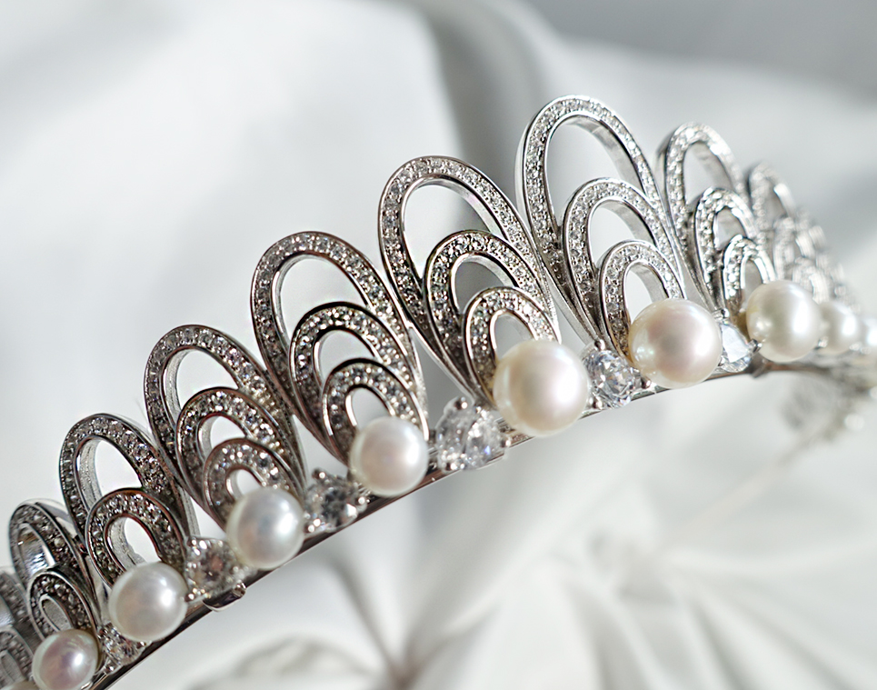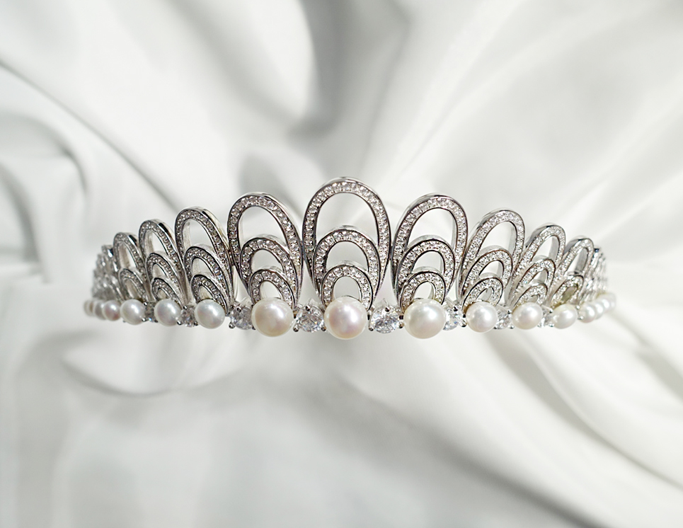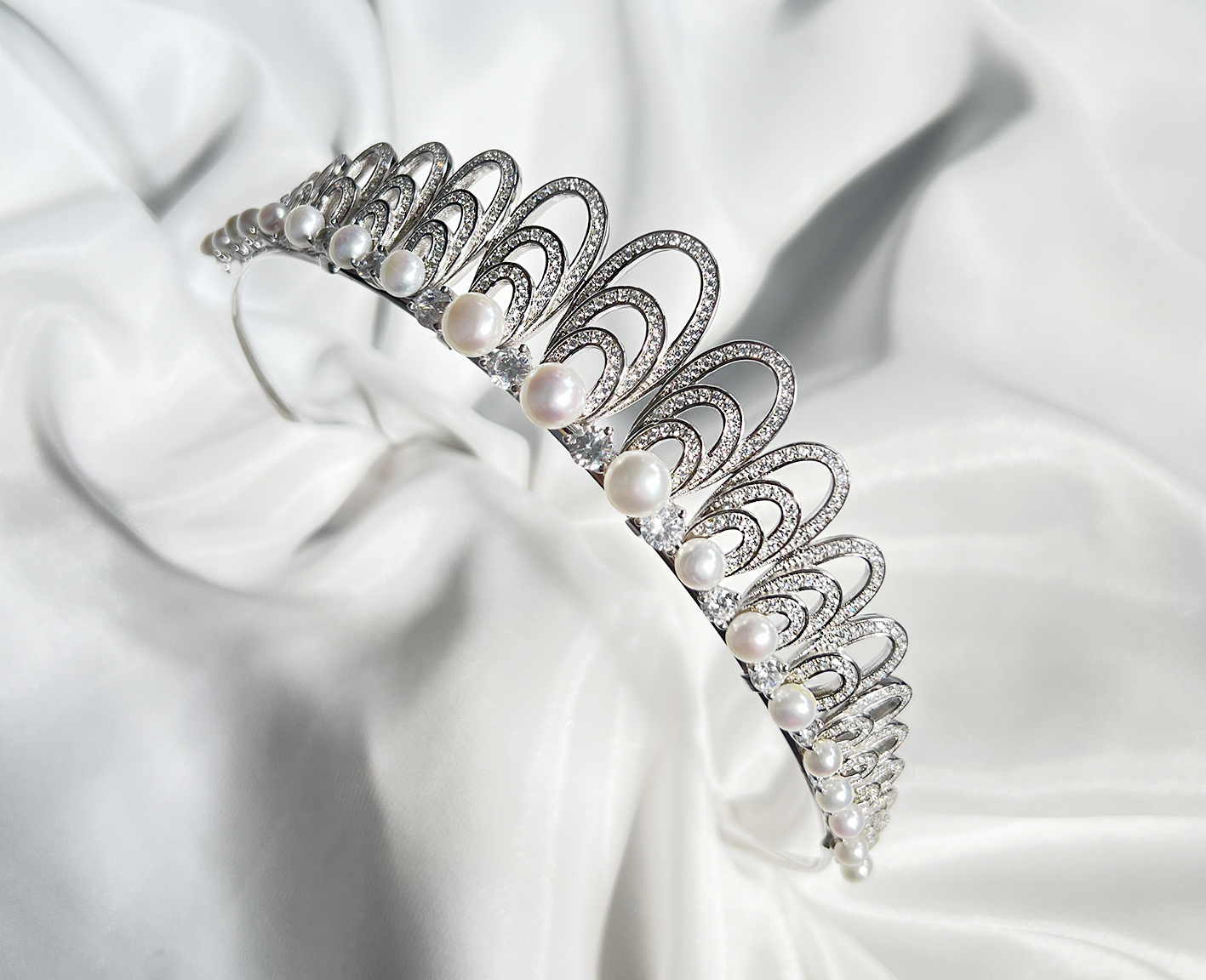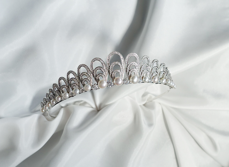 The scallop tiara is a dainty one made up of 19 pieces of freshwater pearls in button shape, and cubic zirconia stones. With delicate and distinctive scalloped lines, this scallop style is unabashedly feminine and bold – our favorite combination.