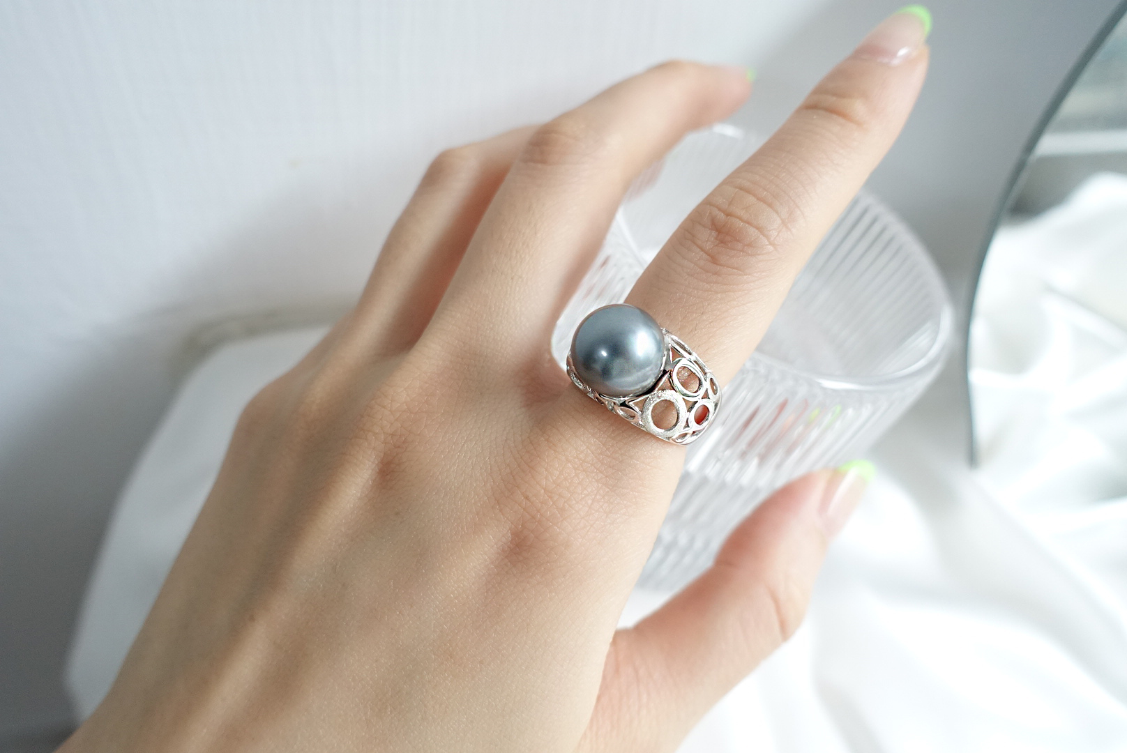 A large 11mm Tahitian round pearl is gently held by a beautifully hollow 925 white gold plated silver band.