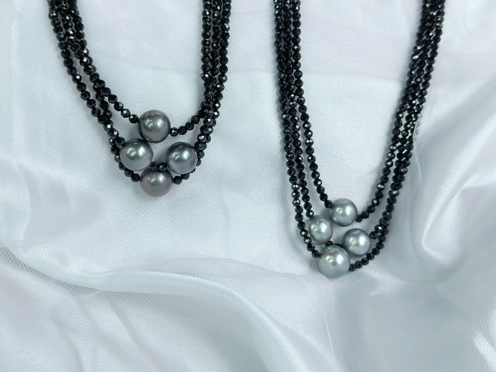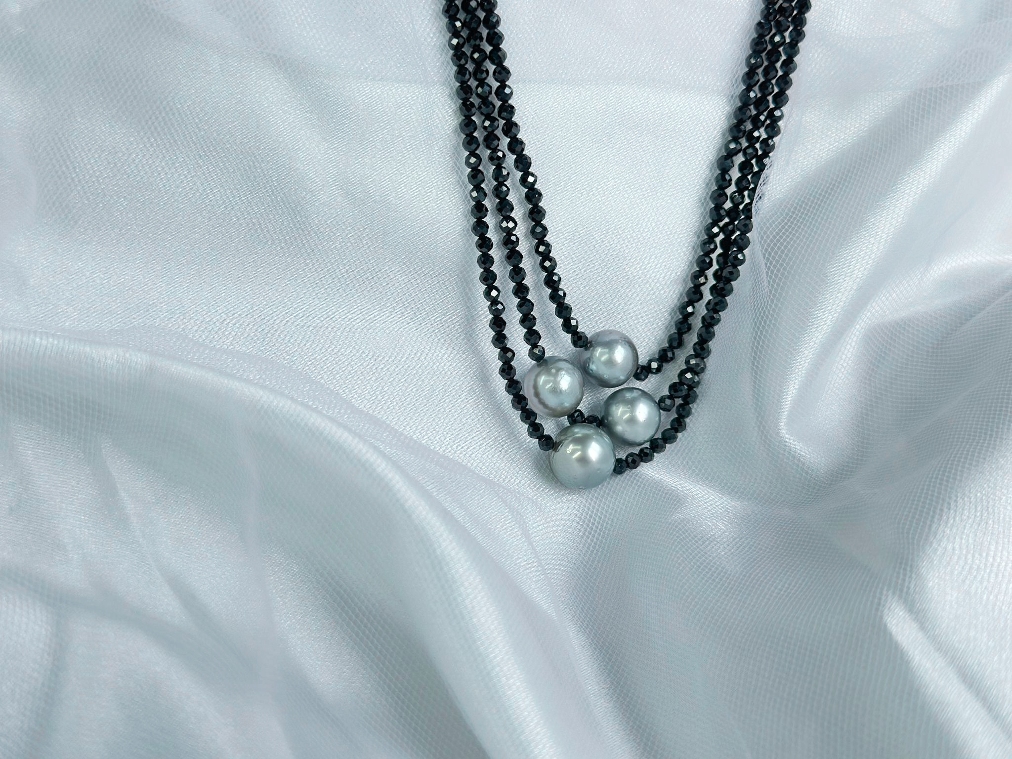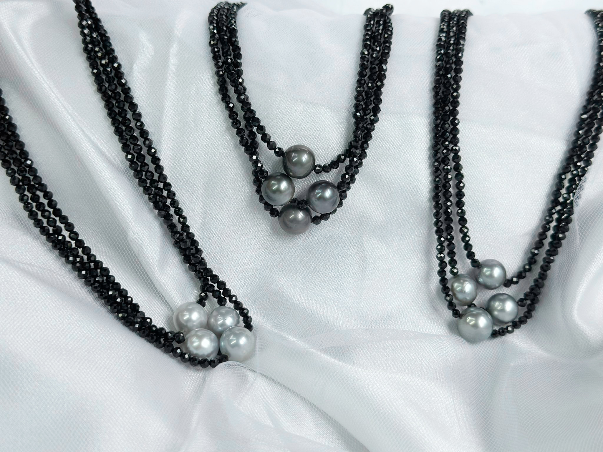 This beaded necklace features three strands of 3mm faceted black spinel, accented with 4 pieces of Tahitian pearls sized approximate 10mm.   Enjoy this layered look without multiple chains mixing up!