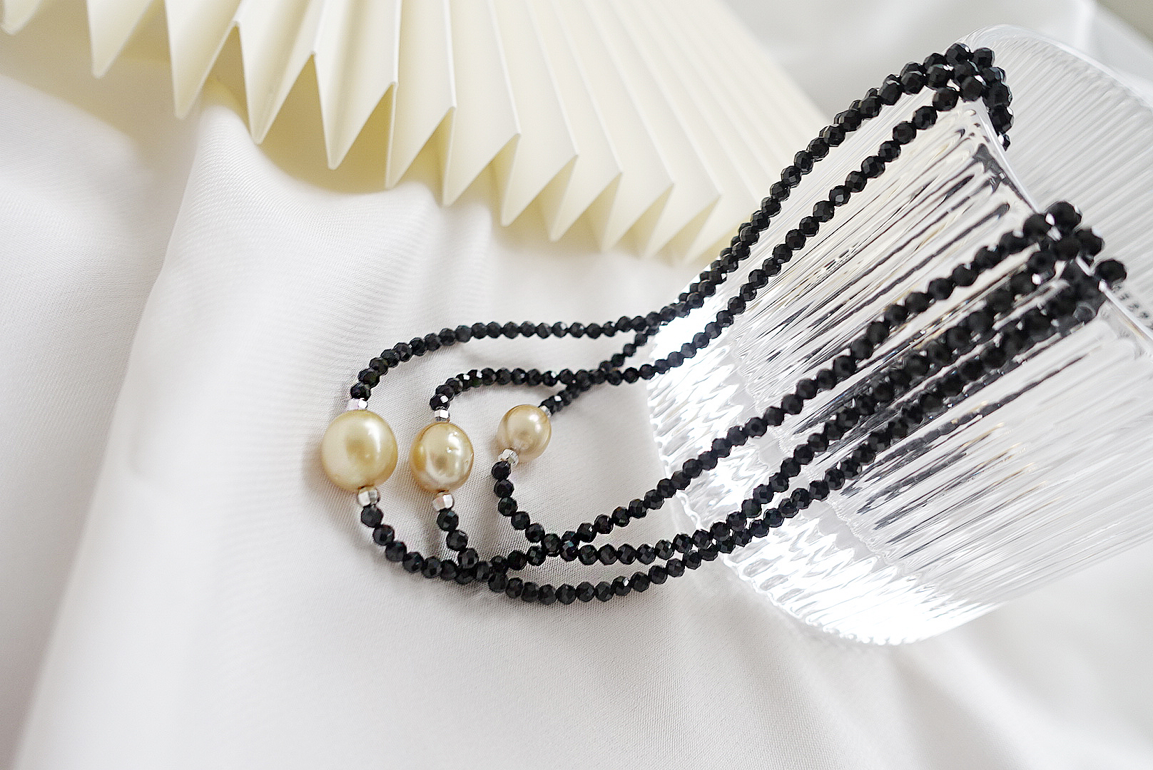Three in one necklace made of a combination of 3mm faceted black spinel stones, accented with three pieces of 8mm+ South Sea golden pearls in drop shape. The necklace is approximately 16.5″ in length and finishes with Japanese metal clasp.